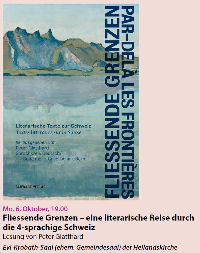 | Termine Graz Kreuzkirche und der evangelischen Kirchen in GrazKantorei Bern-Zürich: Der Geist über den Wassern  So 5. Okt. 18.30 Uhr, Heilandskirche Vom gregorianischen Choral über Chorwerke der Reformation spannen Berner und Zürcher Kantorei mit ihrem Leiter Johannes Günther den Bogen zur strahlend-doppelchörigen Motette „Der Geist hilft unser Schwachheit auf“ von J. S. Bach. Höhepunkt im Programm der diesjährigen Sommerkonzerte zum Thema «Wasser und Geist» ist die Komposition «Sintflut» von Willy Burkhard für gemischten Chor a capella: Der berühmte Schweizer Komponist, dessen 125. Geburtstags 2025 gedacht wird, erzählt in fünf eindrucksvollen Chor-Tableaus die dramatischen Geschehnisse der großen Flut und berichtet tröstlich von Gottes neuem Bund mit den Menschen. Bei dem Konzert der Bern-Zürcher-Kantorei werden auch Mitglieder der Evangelischen Kantorei der Heilandskirche sowie Kantor Tamás Szocs an der Orgel mitwirken. Plakat als PDF zum Herunterladen Lesung von Peter Glatthard  Mo 6. Okt. 19.00 Uhr, Evi Krobath Saal (ehem. Gemeindesaal) der Heilandskirche Peter Glatthard studierte Romanistik (Spanisch und Französisch) und war als Übersetzer und Redaktor des Schweizer Parlamentes tätig. Um die Kenntnis der Schweizer Literaturen und den Austausch zwischen den Sprachregionen zu fördern, arbeitet er seit 2016, z. T. mit eigenen Übersetzungen, an der Textsammlung «Fliessende Grenzen». Entstanden ist ein Leseband, der viel aussagt über das Leben von Schweizerinnen und Schweizern in den vier Sprachregionen und dazu anregt, über Grenzen und ihre Überwindung nachzudenken. Jeweils in Original und deutscher Übersetzung ist Prosa und Lyrik enthalten von Huldrych Zwingli, Henri Dunant, Blaise Cendrars, Conrad Ferdinand Meyer und vielen anderen. Plakat als PDF zum Herunterladen |  |